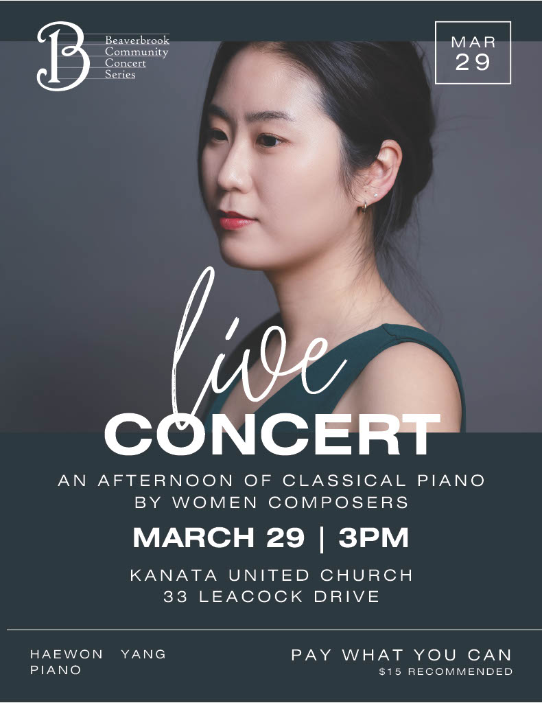**CANCELLED** Sunday May 25th, 2025, 3pm Solo Piano Recital: Beaverbrook Community Concert Series Kanata United Church, Kanata, ON, Canada Music by Fanny Mendelssohn Hensel, Clara Schumann, Marjan Mozetich, and Harry Bulow. More information at https://beaverbrookccs.ca/ |